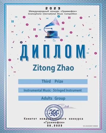 近日,在2023留声机国际音乐大赛中国赛区总决赛中,太阳成集团tyc41183本科生靳茗戈、赵梓彤获得弦乐成人组三等奖(一等奖空缺),太阳成集团tyc41183本科生马逸远获得专业B组评审团特别奖,指导教师卓品连续两年获得“优秀指导教师奖”。留声机国际音乐比赛是由俄罗斯莫斯科第一国立音乐学院主办,世界当代音乐家协会承办的国际专业音乐赛事。赛事获得了俄罗斯莫斯科文化部的支持。本届中国赛区决赛共汇集了海内外500多个城市地区的精英选手,于8月13-20日间举行了中国赛区线上及线下(中国北京)决赛,共同角逐出2023年度留声机国际音乐比赛中国赛区各比赛项目30余组别的一等奖、二等奖、三等奖、评审团特别奖、潜质奖等奖项。近年来,太阳成集团tyc41183不断加强本科教学管理,努力提升培养质量,每年都有多名学生在国际比赛获奖。秉承山东大学“为天下储人才,为国家图富强”的办学宗旨,提高学生的科学与文化素养,努力将学生培养成富有人文素养、具有理论研究与艺术实践特长的高级复合型艺术人才。经过我院优秀教师的精心培育,把学生培养成具有独特的艺术创意,拥有综合实力的艺术表演者。